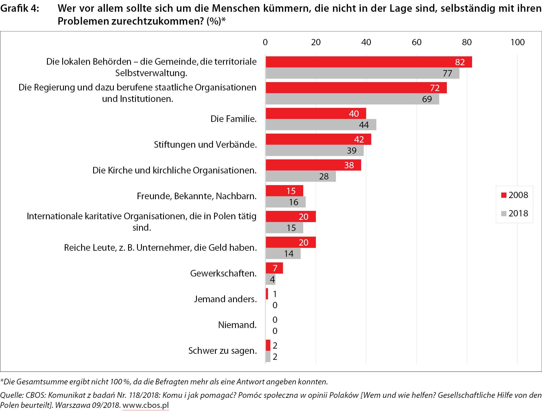 Die Frage der sozialen Gerechtigkeit steht momentan in Polen aufgrund der Sozialpolitik von Recht und Gerechtigkeit (Prawo i Sprawiedliwość – PiS) hoch im Kurs. Damit wird seit einigen Jahren ein Thema zurück auf die politische Agenda geholt, das in Hochzeiten des freien Marktes scheinbar nur eine Aufgabe der gesellschaftlichen Selbstorganisation und nicht des Staates war. Die PiS knüpft hier an Traditionslinien der Gewerkschaft Solidarność an und kann sich zudem auf das Erbe der katholischen Soziallehre wie auch auf große gesellschaftliche Akzeptanz ihrer Sozialpolitik stützen. Internationale Indizes belegen tatsächlich einen Aufholprozess Polens gegenüber westlichen Ländern bei der Bekämpfung von Armut und bei der Einkommensverteilung, allerdings offenbaren diese Indizes auch, dass hinsichtlich der Generationengerechtigkeit oder mit Blick auf die Diskriminierung von sozialen Gruppen die PiS gegenwärtig nur einige Aspekte von sozialer Gerechtigkeit implementiert.